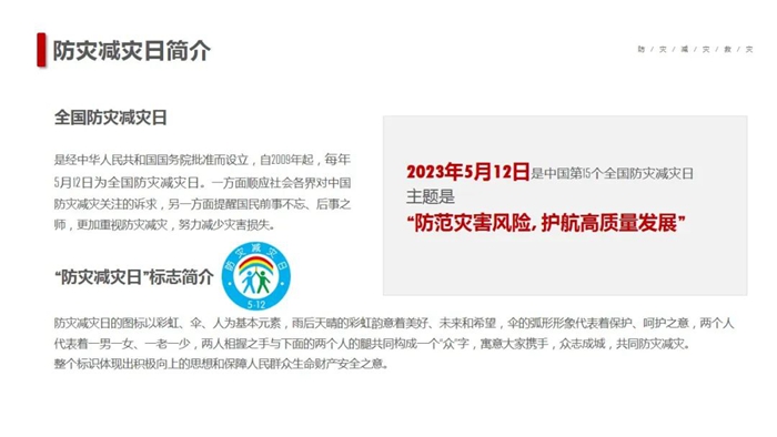 在第15个“5·12全国防灾减灾日”到来之际,北京化工集团按照党中央、国务院、北京市委市政府部署的工作要求,以“防范灾害风险,护航高质量发展”为主题,深入开展防灾减灾宣传,以增强全系统干部职工安全忧患意识,提高防灾减灾及应对能力。