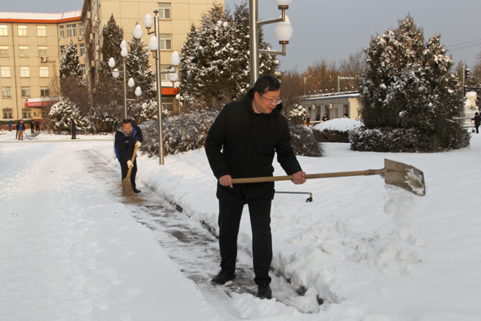 刚到单位的干部职工,纷纷拿起扫帚、铁锹,加入到扫雪除冰大“会战”的队伍中。大家齐心协力、现场一片热火朝天,干净整洁的道路很快清扫出来,保证了干部职工出行安全。