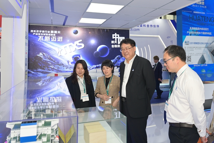 展会期间,北京化工集团党委副书记、董事、总经理杨旭辉,副总经理张荣寰,总会计师金黎明也来到集团展台参观指导。杨旭辉一行听取了现场各企业的详细介绍,深入了解现场展示的储氢瓶内胆材料、LNG船用胶、航天手套等高精尖产品,亲切慰问现场工作人员。
